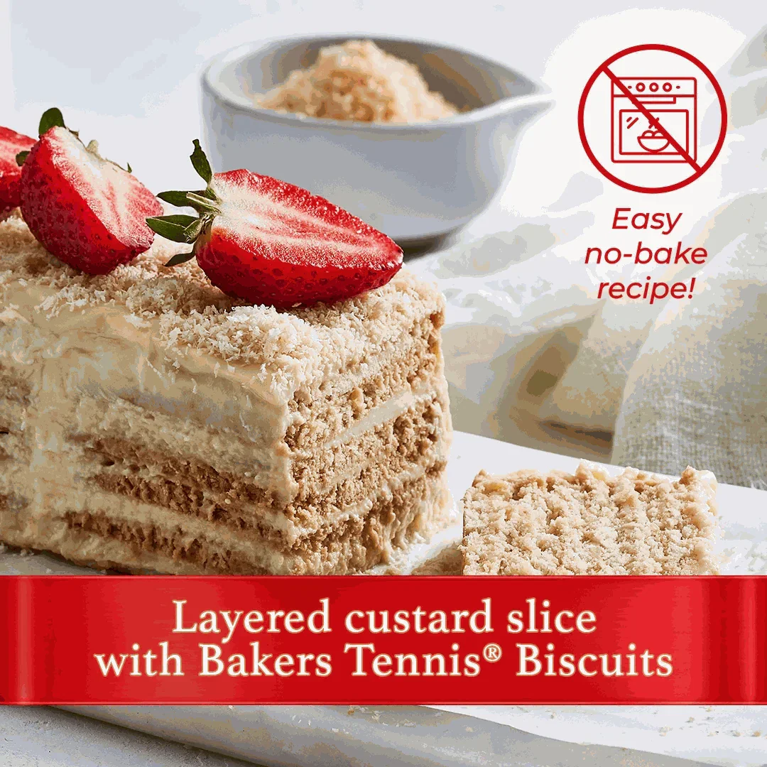 Craving a taste of home? Bakers Tennis Biscuits are here to bring a smile to your face! Loved since 1911, these biscuits offer a timeless blend of buttery goodness and tropical coconut flavor. Perfect for a nostalgic tea time or as a versatile dessert base, they're a must-have in your pantry.