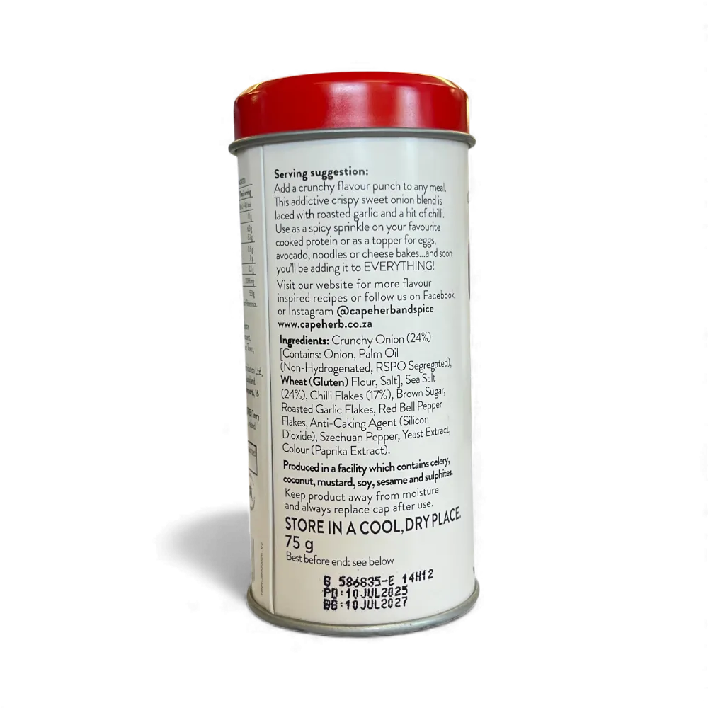 A crunchy, spicy, savoury chilli and onion blend that adds flavour and heat to absolutely everything. Perfect on eggs, avo, noodles, veggies, chicken, meats, pizza, dips and more.