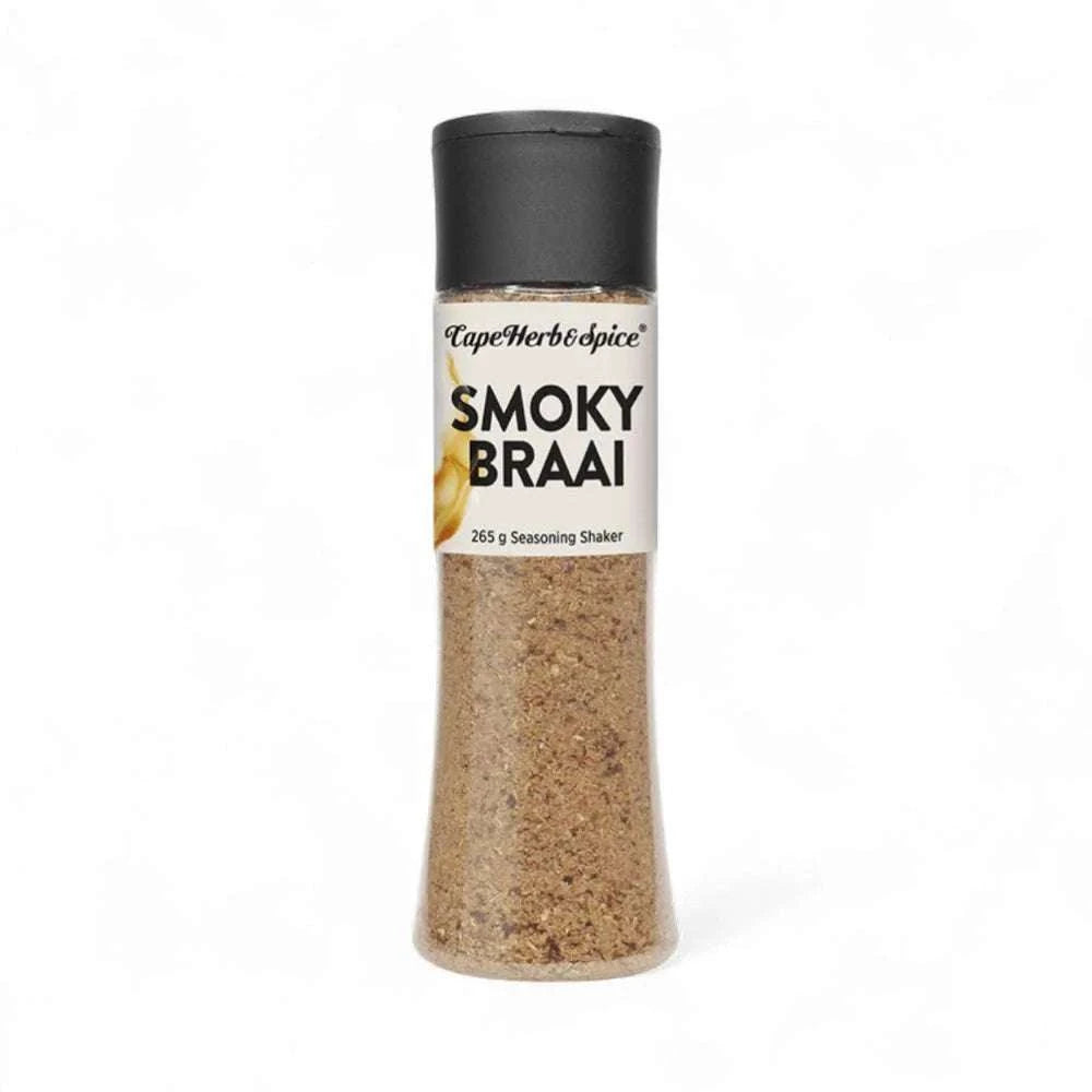 Bring the bold, smoky flavour of a traditional braai to every meal with the Cape Herb & Spice Smokey BBQ Braai Shaker. Perfectly blended with sea salt, brown sugar, coriander, paprika, black pepper, cloves, and a hint of smoky flavour, this seasoning enhances the taste of pork, beef, chicken, or lamb chops whether grilled on the braai or roasted in the oven.