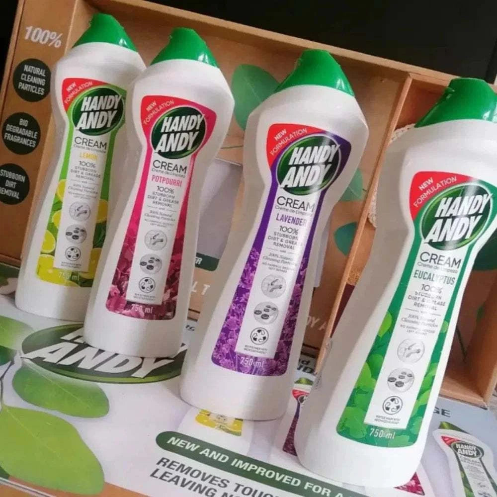 Handy Andy Cream Lemon is designed to provide a powerful clean with a fresh lemon scent. The 750ml bottle, featuring Cleanboost technology, tackles tough dirt and grease while being safe to use around the home, including food preparation areas.