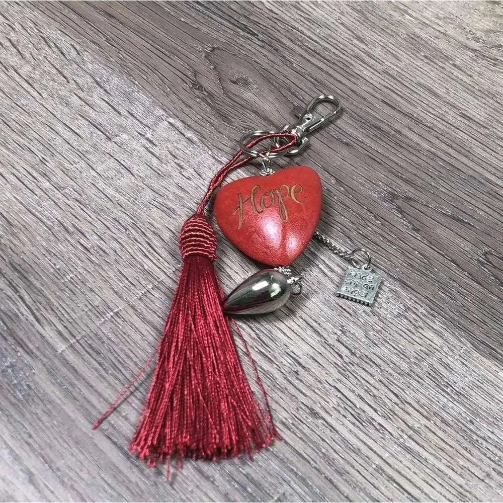 Keyring - Red Heart with "Hope" Large Red Heart Heart Size 50mm This elegant keyring is a charming reminder of hope, constructed with a large 50mm red heart. Perfect for attaching to your keys or other items as a stylish keepsake.