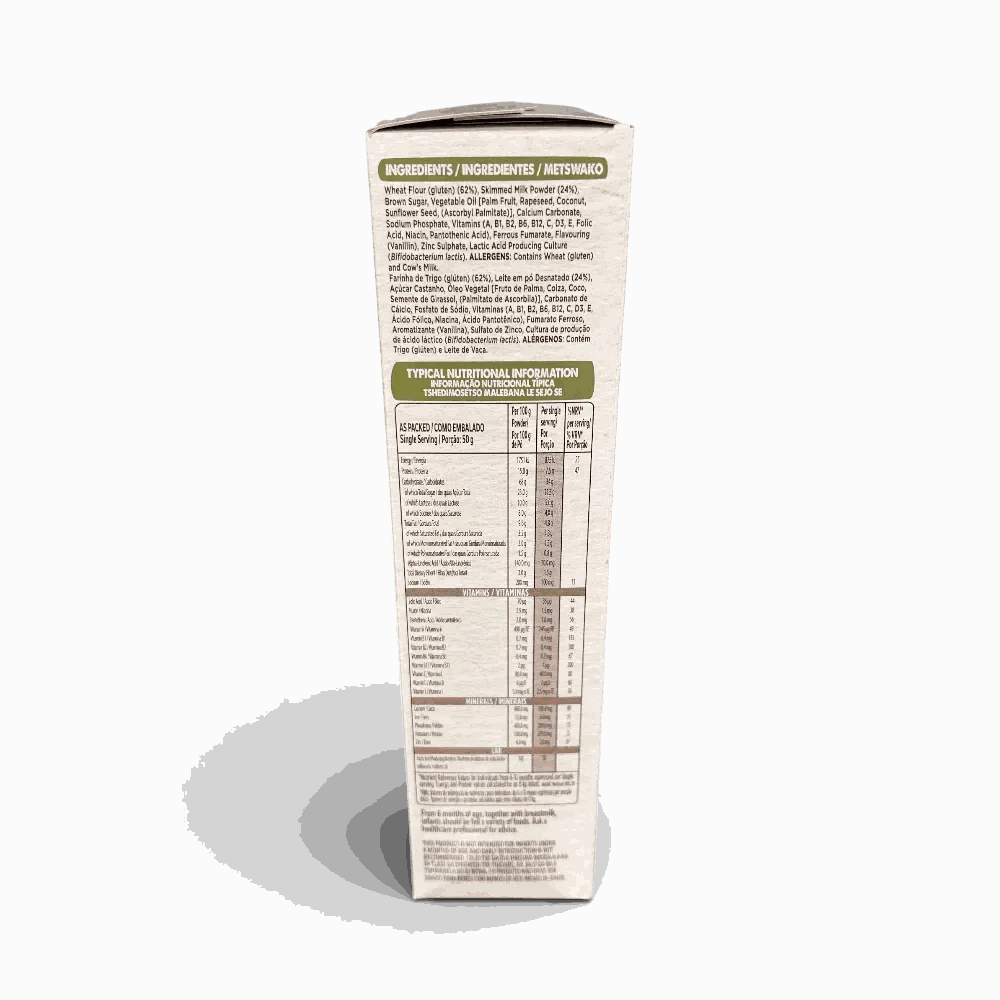 Wheat Flour (Gluten), Skimmed Milk Powder (25%), Vegetable Oil (Palm Fruit, Rapeseed, Coconut, Sunflower Seed), Sugar, Ascorbyl Palmitate, Calcium Carbonate, Sodium Phosphate, Vitamins (A, B1, B2, B6, B12, C, D3, E, Folic Acid, Niacin, Pantothenic Acid), Ferrous Fumarate, Zinc Sulphate, LAB Culture (B. lactis).