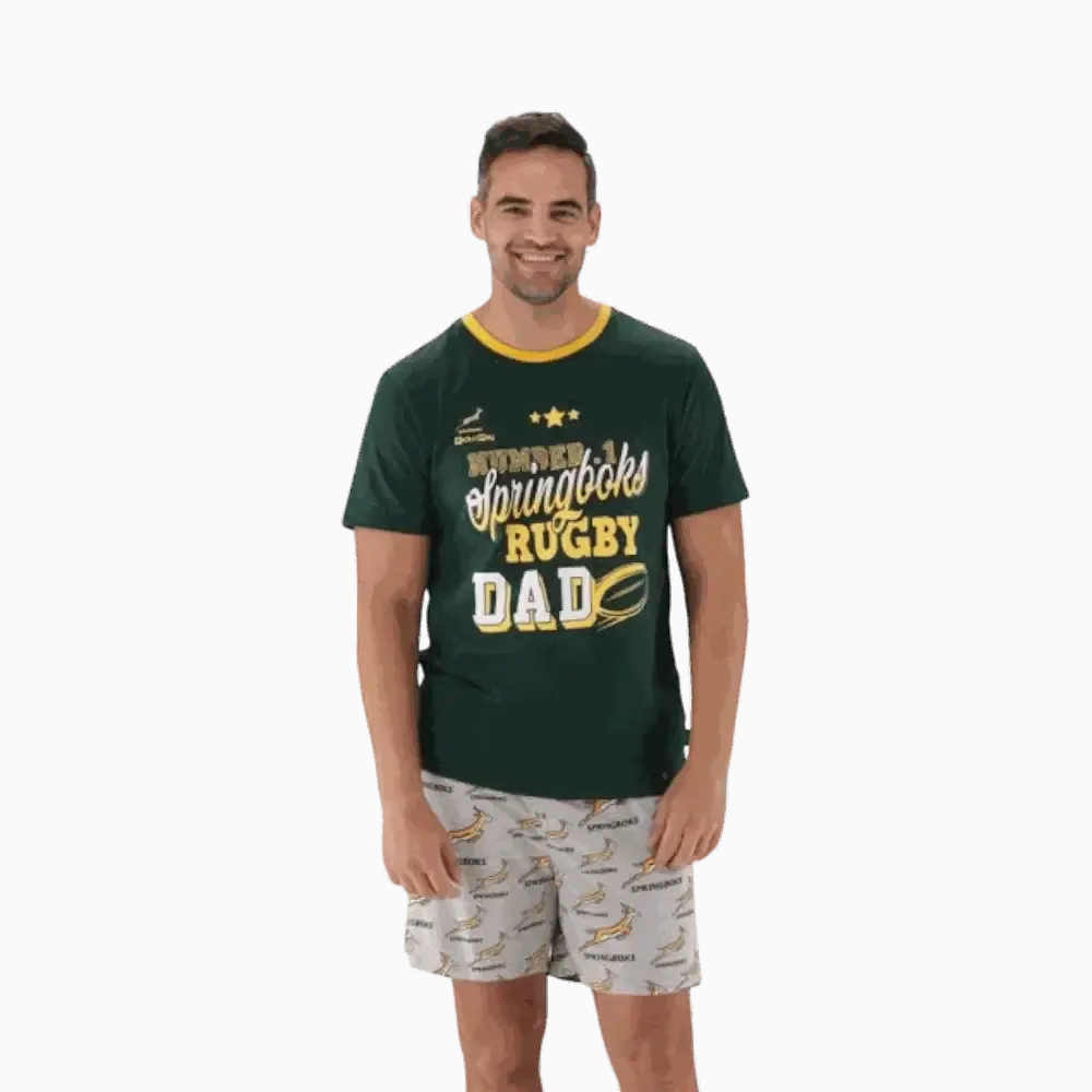 Made from 100% soft cotton, this short-sleeve pajama set includes a crew-neck top in Springbok green with bold “Number 1 Springboks Rugby Dad” print, and matching elastic-waist shorts featuring the official Springbok logo pattern.
